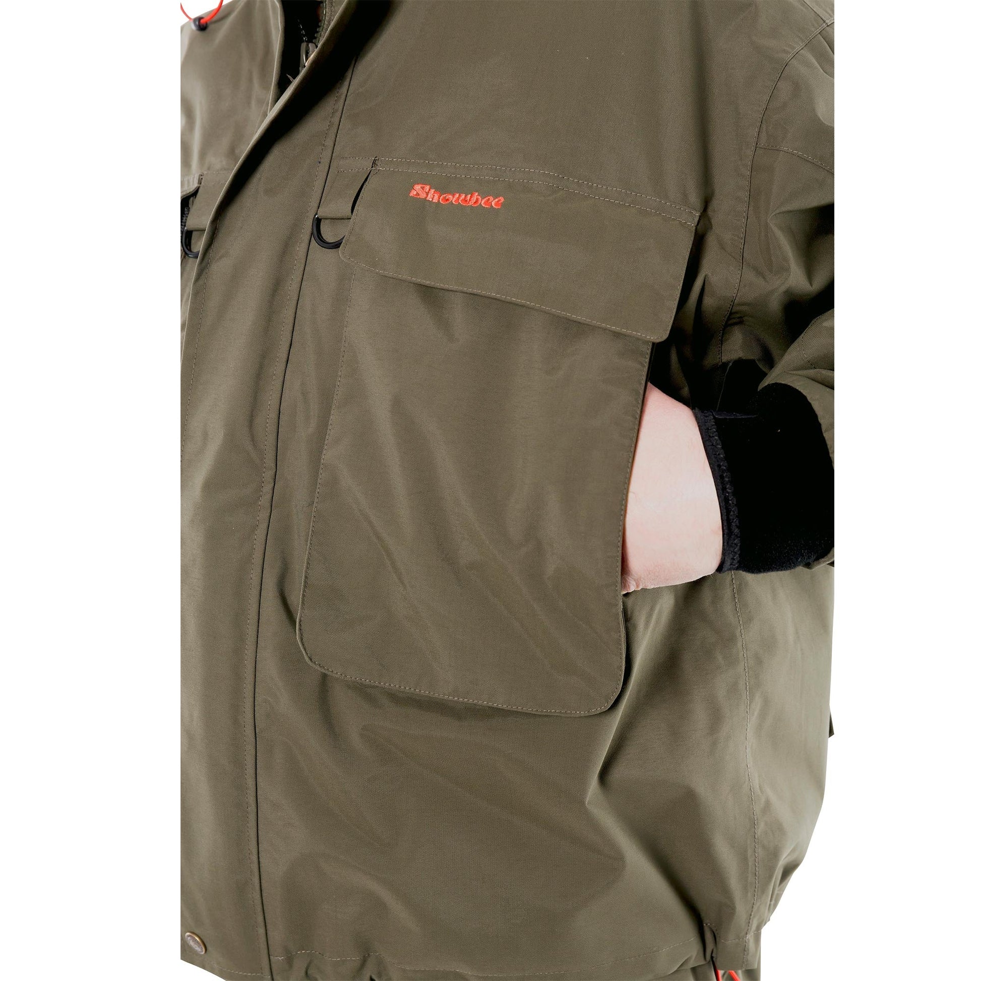 Large rear pocket with zipper and strong D-Ring on the back for landing nets and accessories. Articulated elbows for comfort and ease of movement. Adjustable waterproof neoprene cuffs with Velcro adjuster straps. Adjustable elasticated waist draw cord. Two large front bellows pockets will swallow the largest of fly boxes and hand-warmer pockets are located behind them for relaxed comfort.