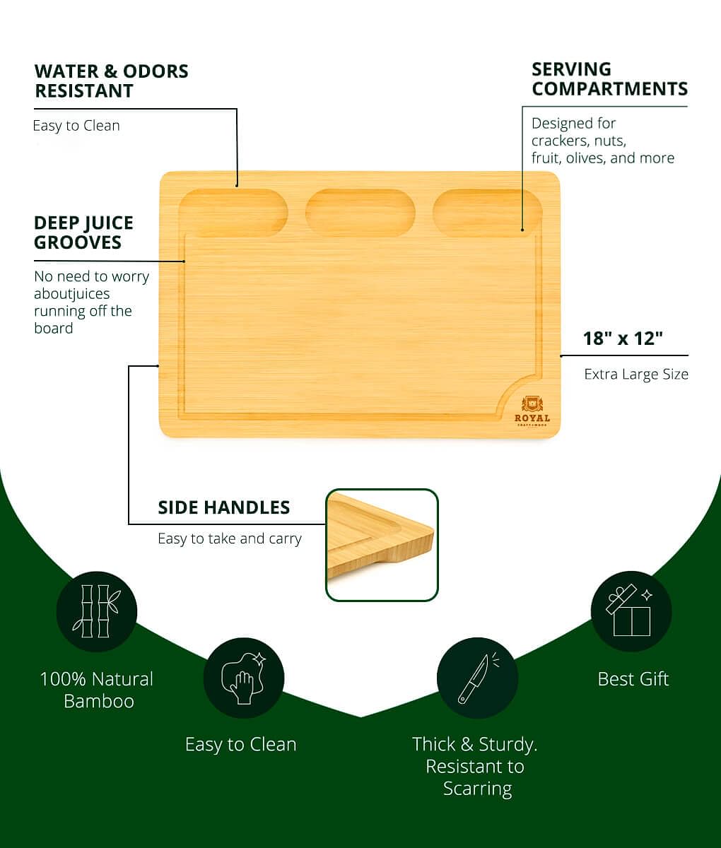 KNIFE-FRIENDLY SURFACE: The worst is when your chopping surface makes your knives dull quickly. We know the struggle! Lucky for you, our trays feature a nonporous bamboo surface that is knife-friendly and protects your blades. Scar-resistant, each board is sealed to prevent cuts and scarring and deter smells and bacteria buildup. A wonderful present for foodies looking to step up their meal prep or hosting game.