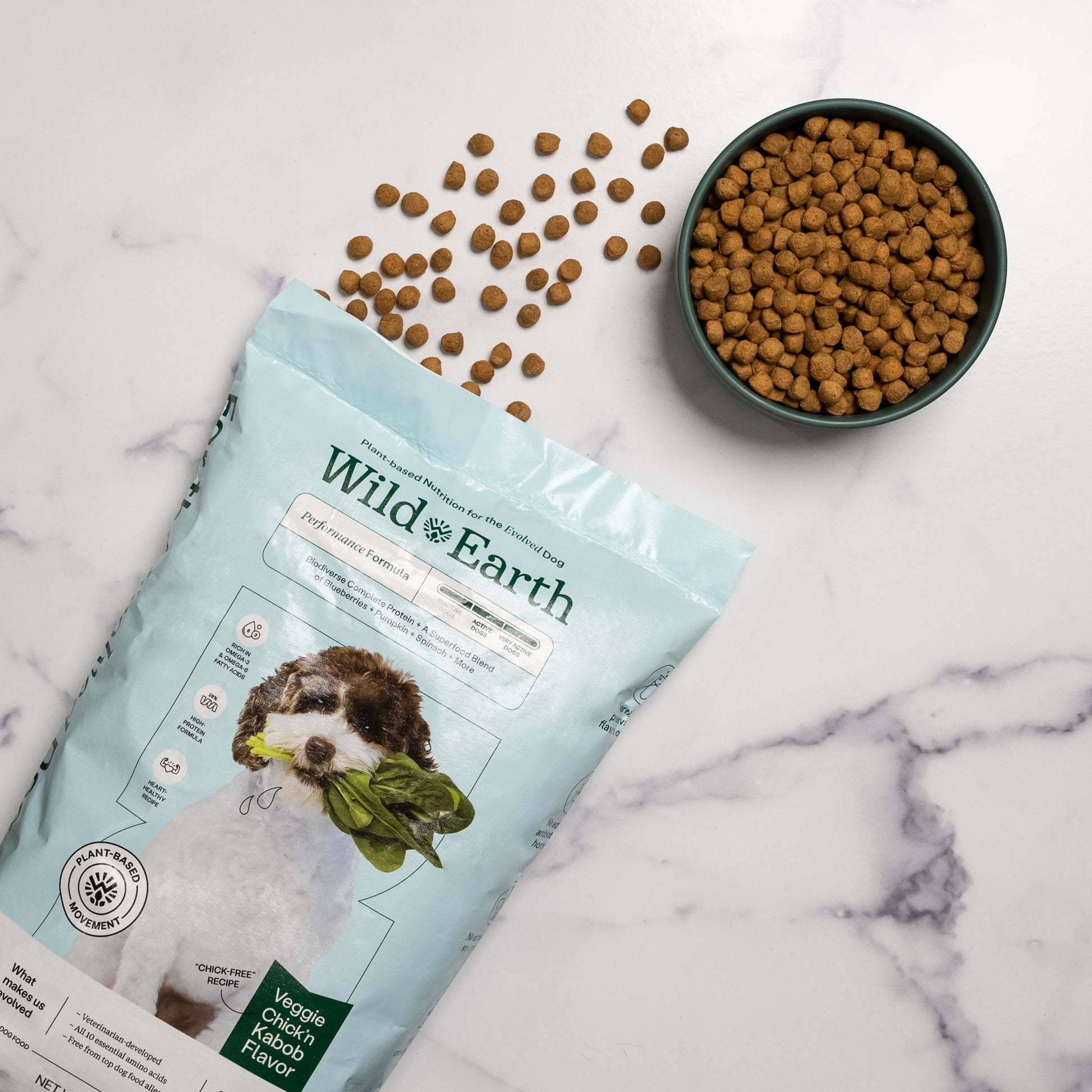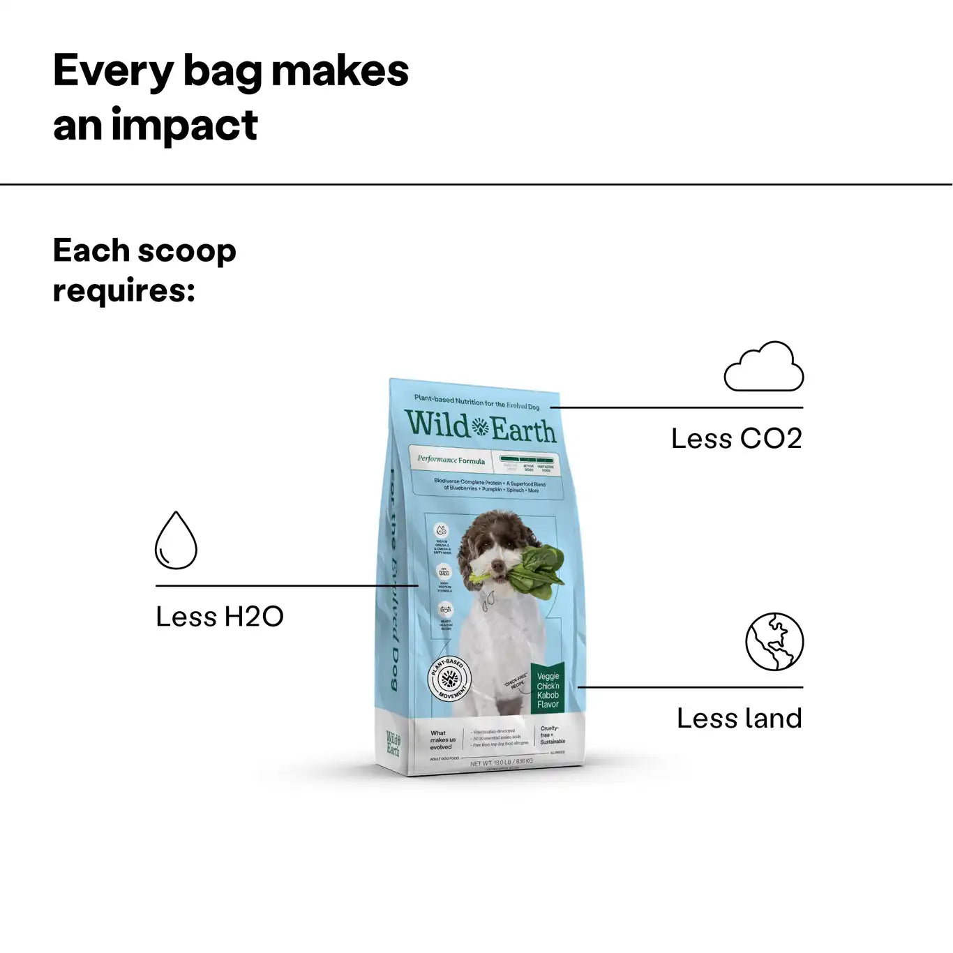 - SUSTAINABLY SOURCED: With every bag of Wild Earth, you help reduce the impact of the pet food industry; Our food requires less water and emits less CO2 than meat-based kibble!
