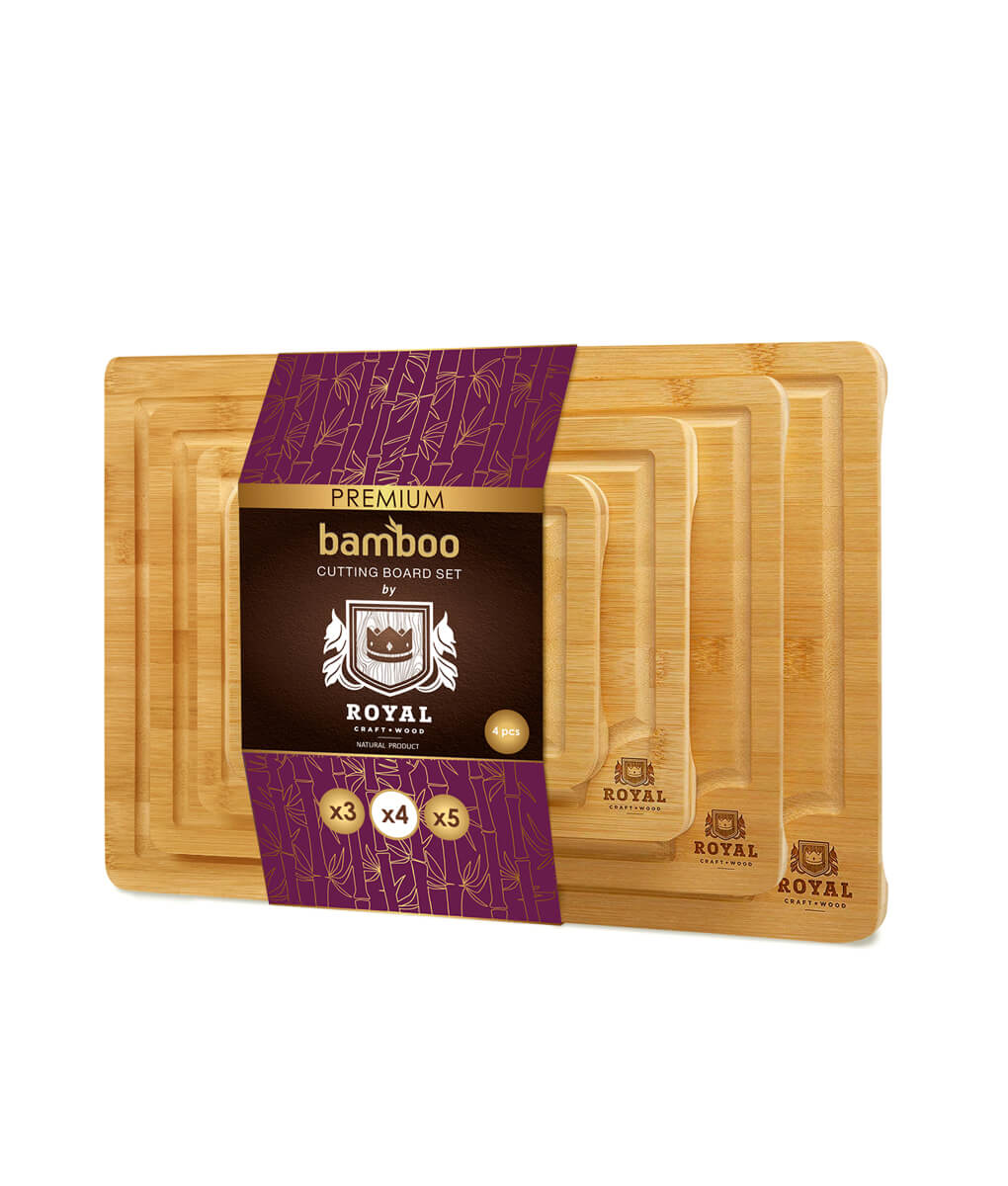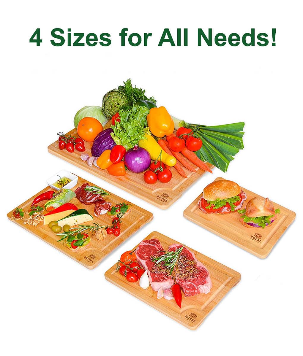 A SET OF CUTTING BOARDS WITH JUICE GROOVES: With this collection, you'll have more than enough cutting board surface space to venture out with new meals and sweet treats without leaving a mess all over your counters. All four of our set feature deep grooved edges to capture any runny liquids from your fruits, vegetables, and meats. Even during the busiest and most chaotic of meal preparations, this set of 4 chopping boards will maintain a neat and tidy workstation.