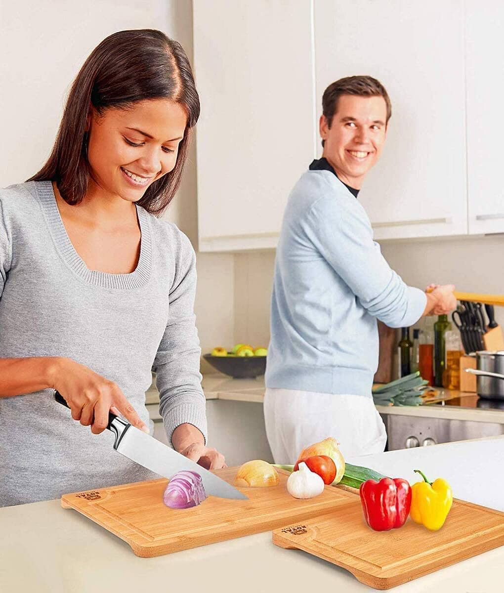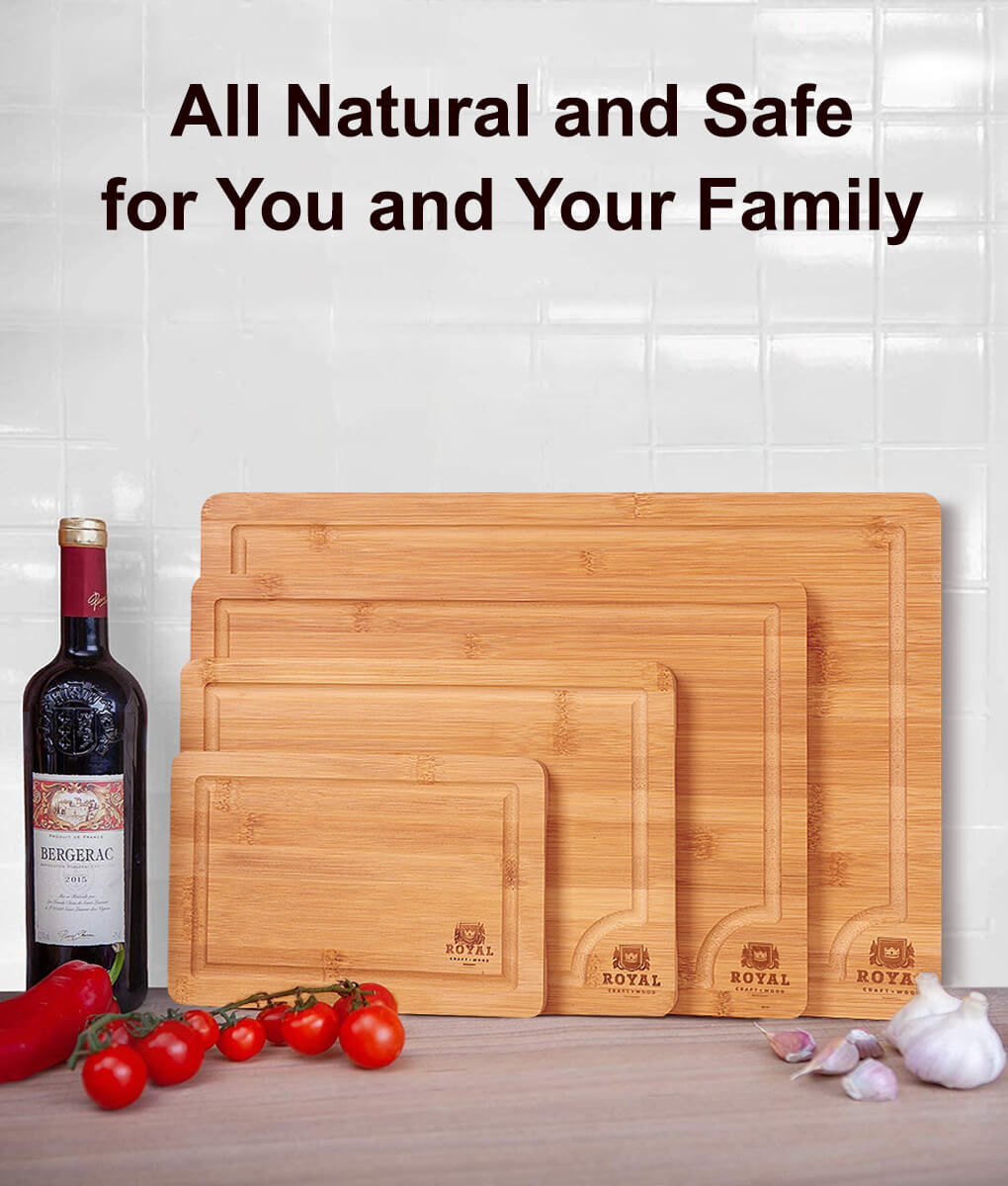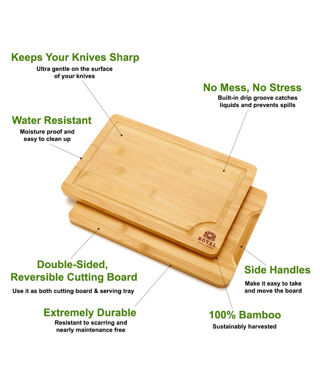 PREMIUM CUTTING BOARDS FOR THE KITCHEN: Thanks to bamboo's robust and resilient composition and our sealed design, you'll be pleased to find that our board’s nonporous surface is both oder- and water-resistant. Made so you don't have to fret about smelly meat juice or pungent garlic smells seeping into its end grain fibers and stinking up your next meal. This prevents cross-contamination so that you can use each board to your liking without fear! Its organic structure is also knife-friendly, ensuring your blades won't dull with each use.